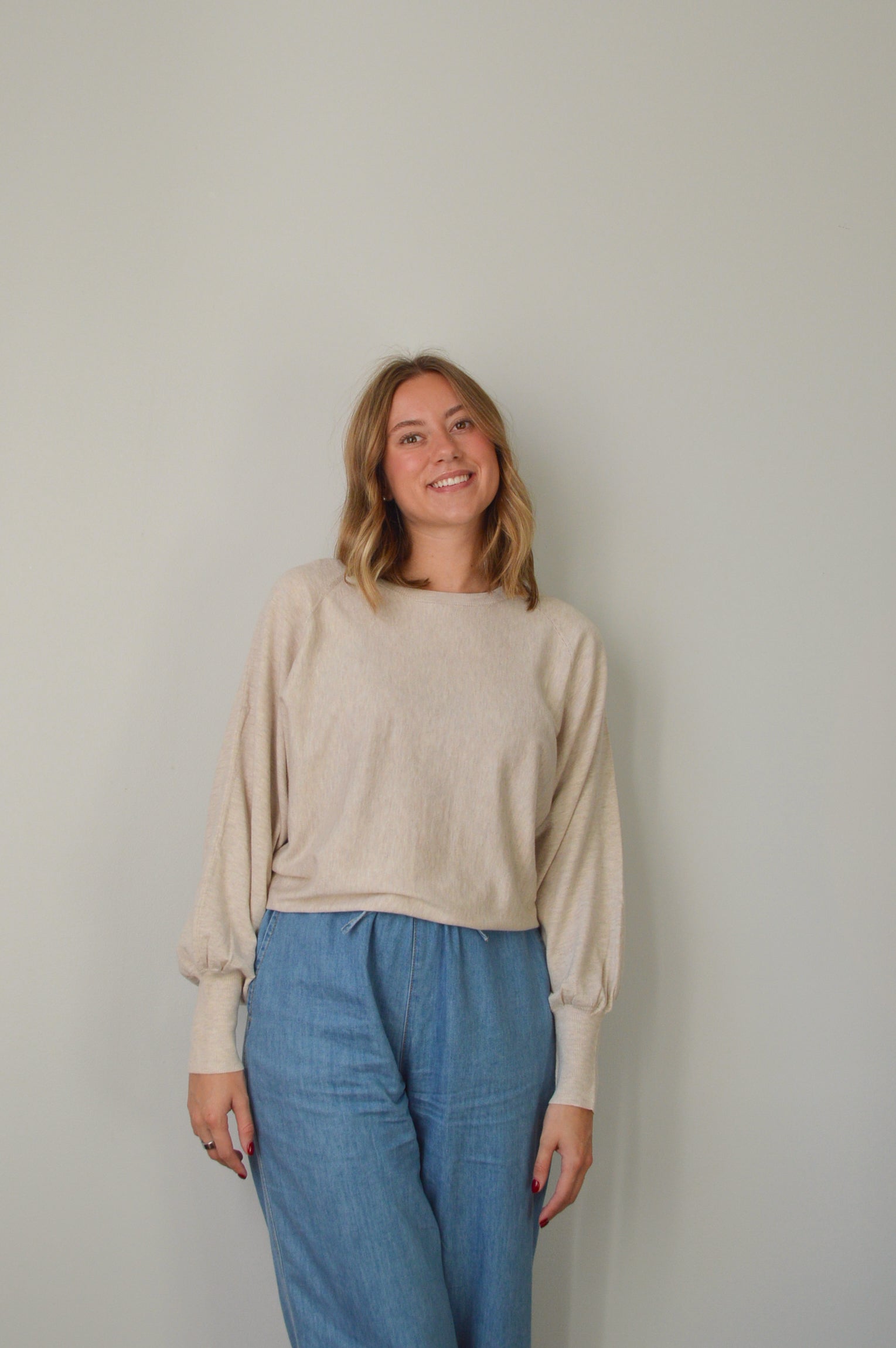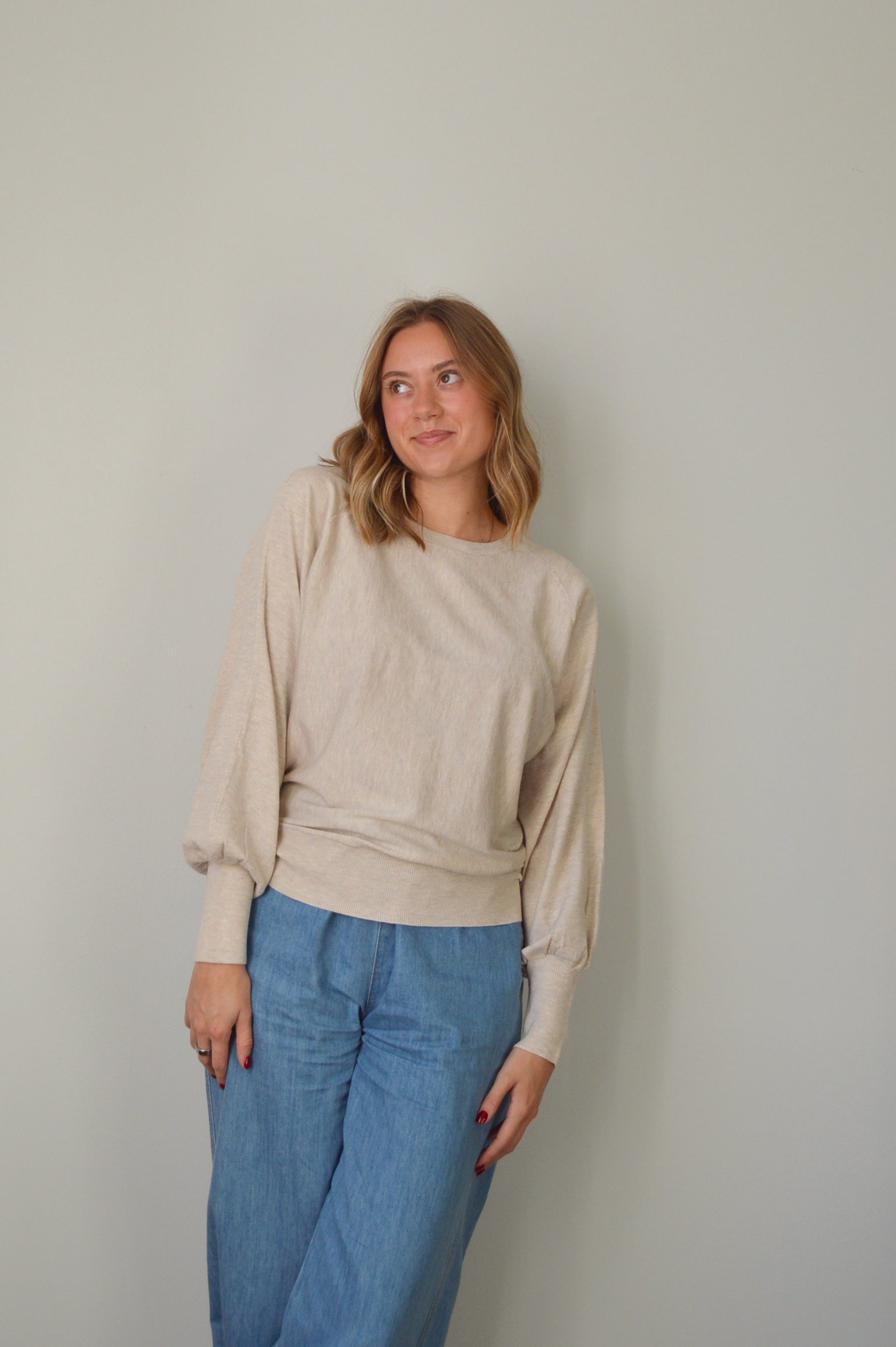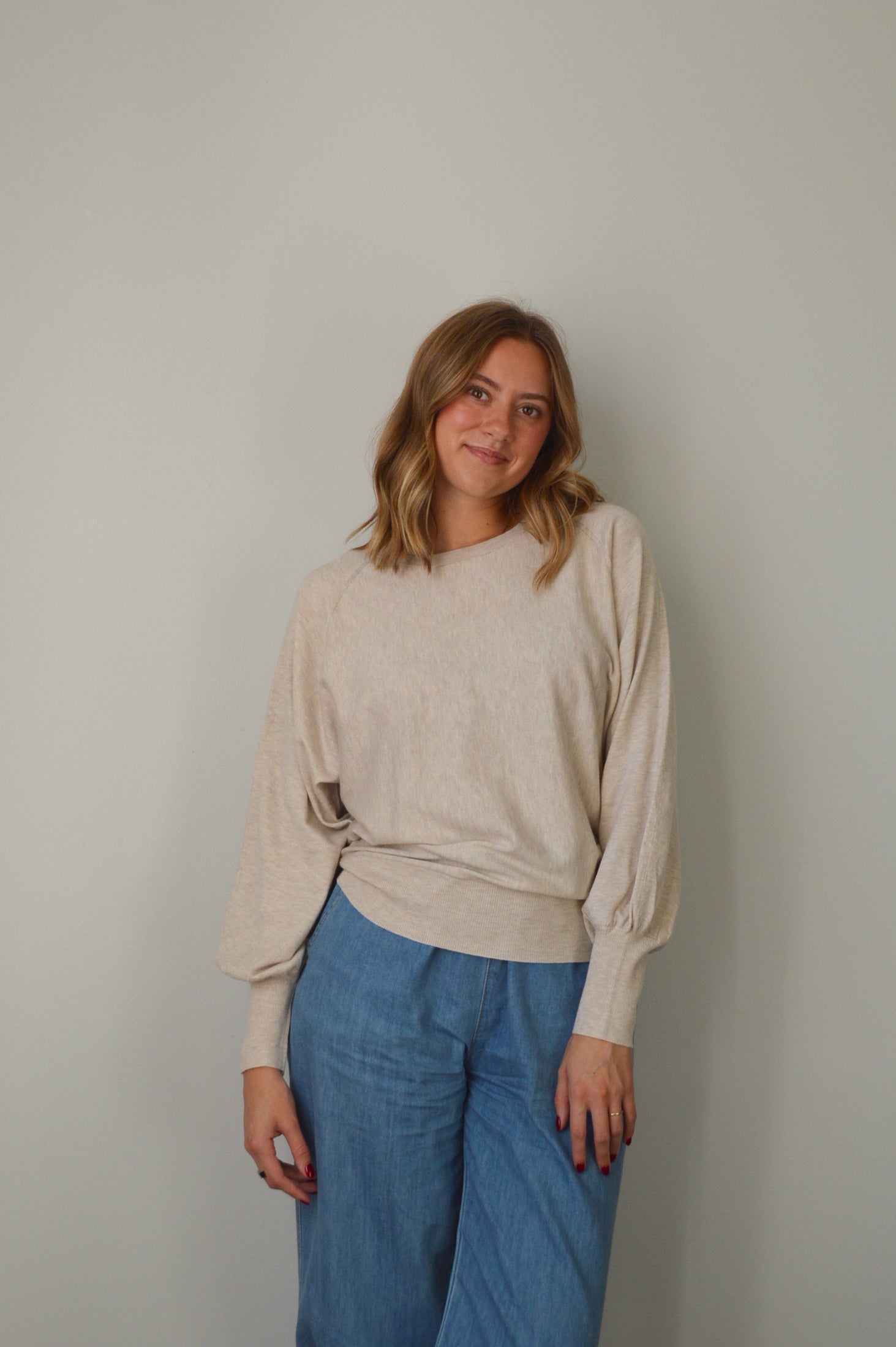 The ANISTON OAT TOP is your new go-to sweater with delightfully billowy sleeves and a cozy, soft feel. It's relaxed fit in a warm oat shade makes it perfect for kicking back or adding a touch of charm to your casual outfits.