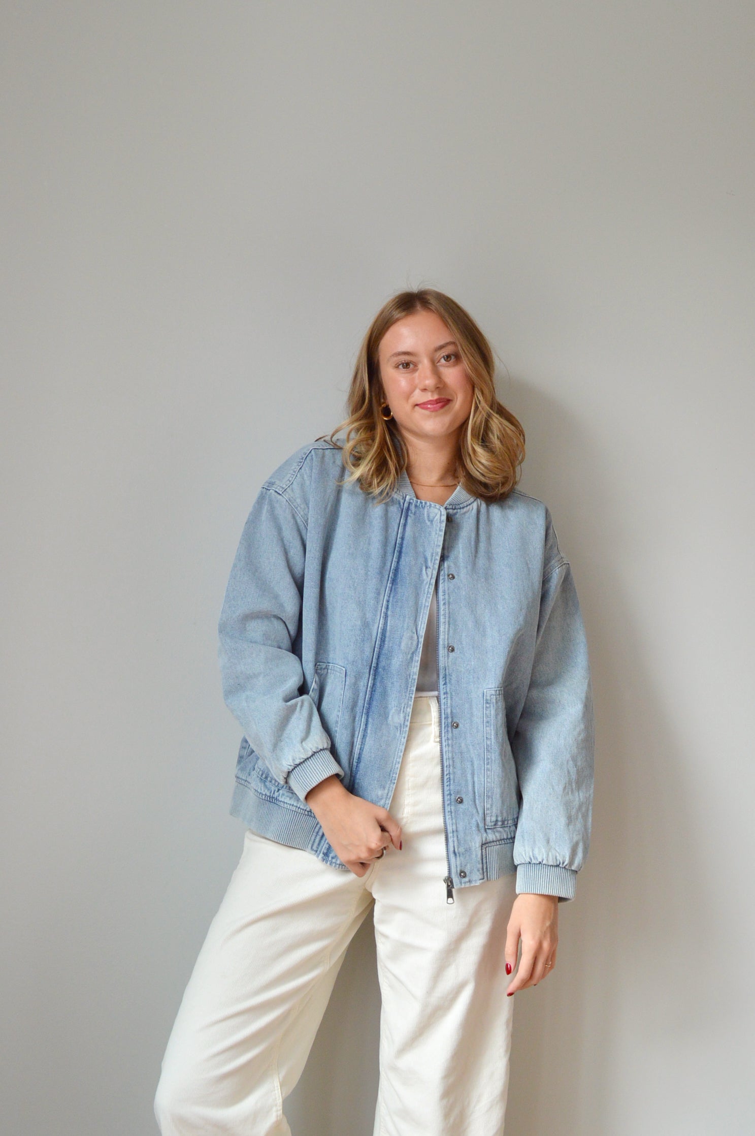 Our DENIM BOMBER JACKET brings sporty vibes to your casual wardrobe with a fun twist. Crafted from durable cotton, it offers a cool, laid-back look. Perfect for layering on a brisk day.
