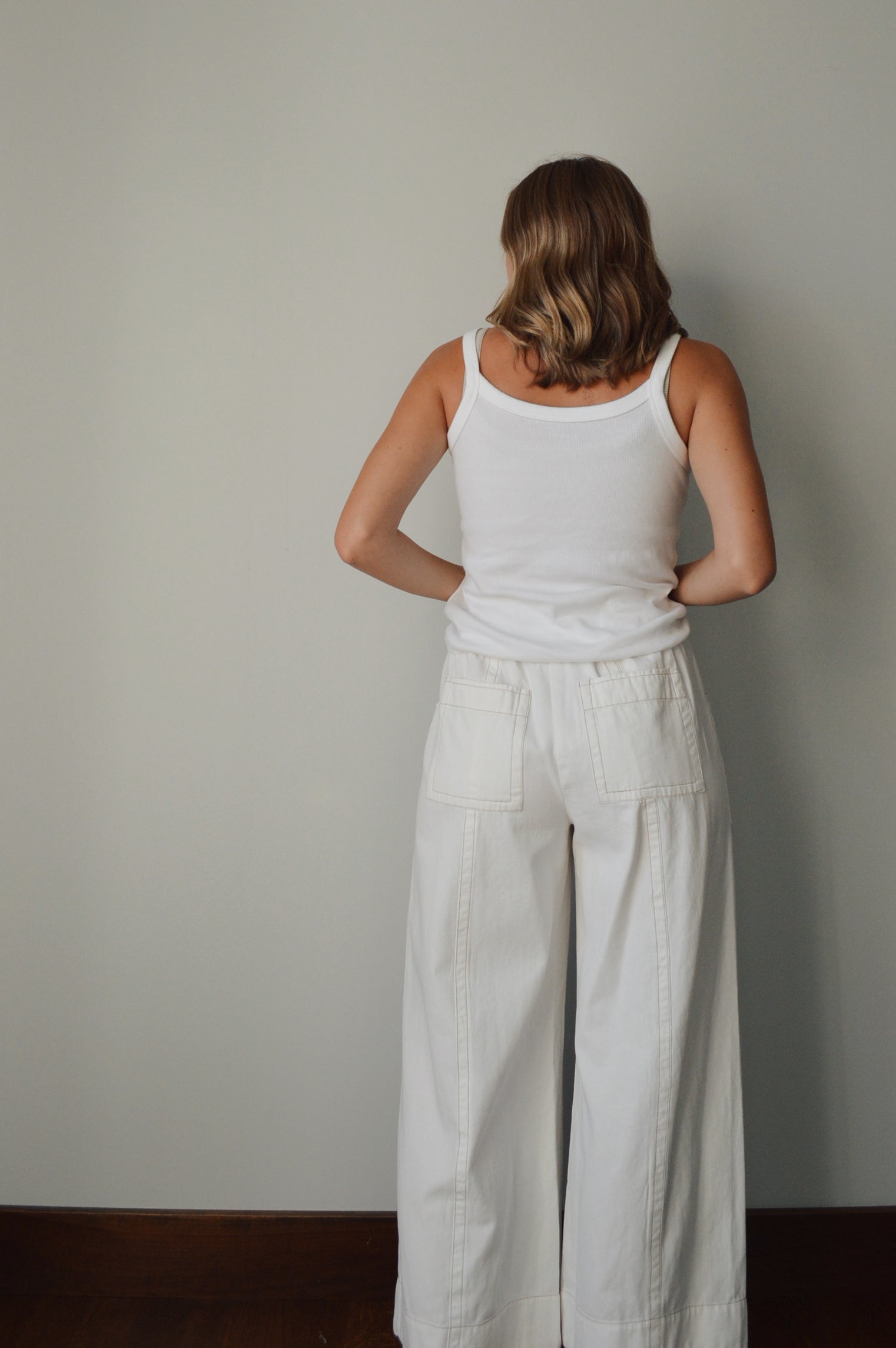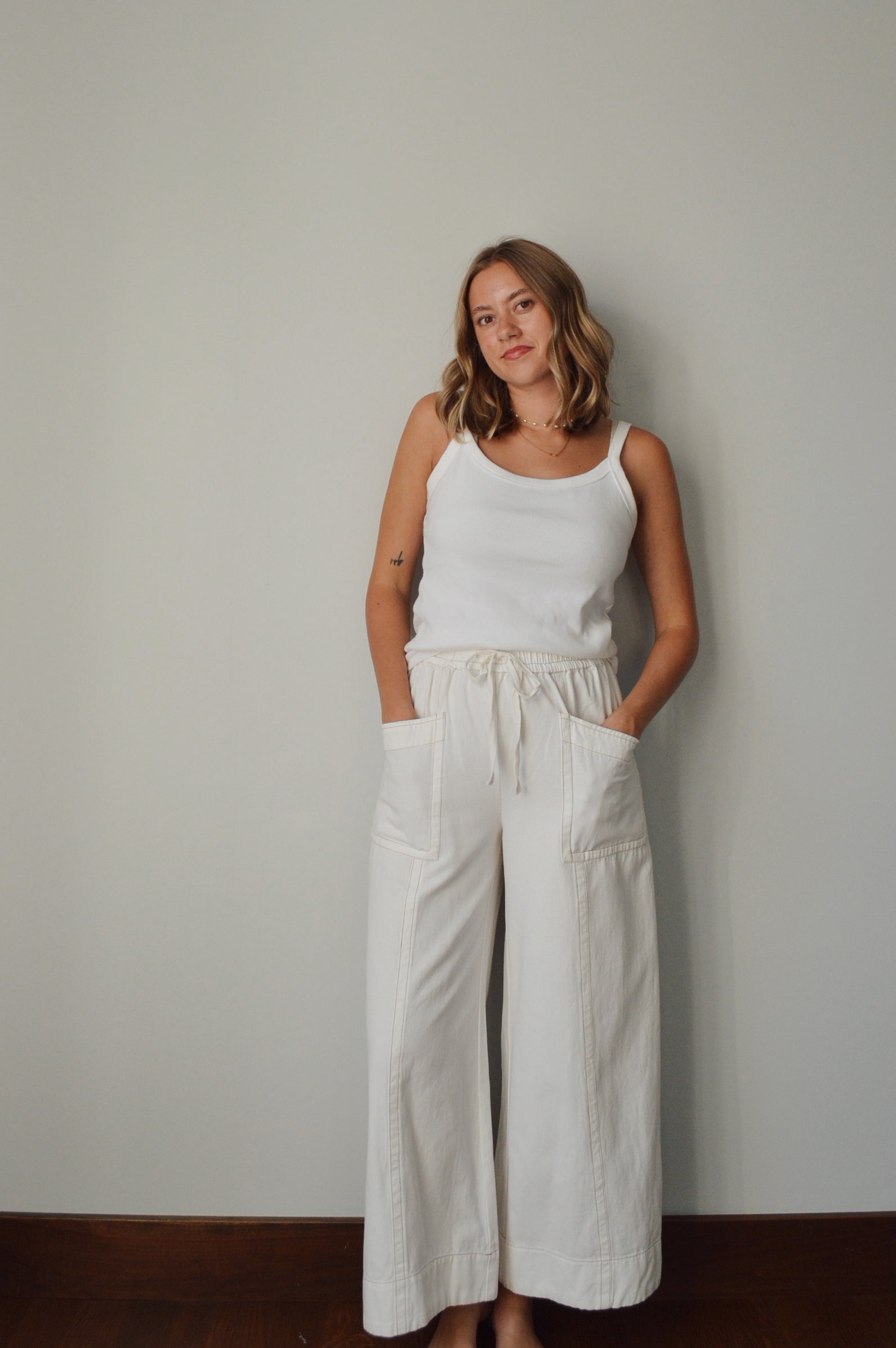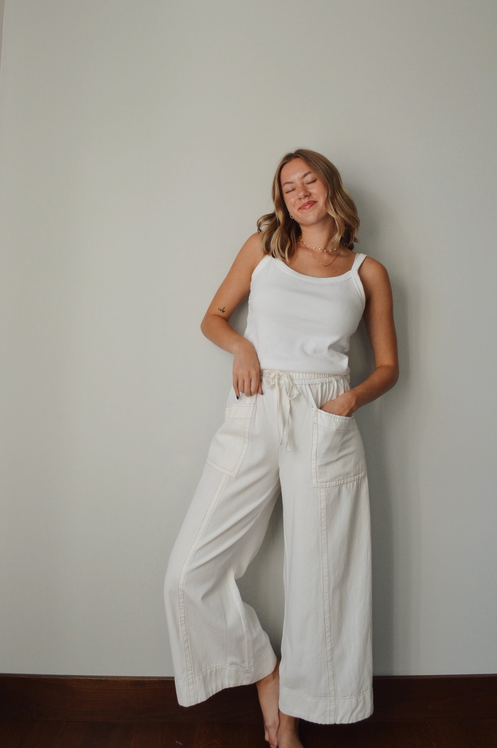 These cream pants are a fall staple for your closet! They feature a wide leg & contrast stitching detail.