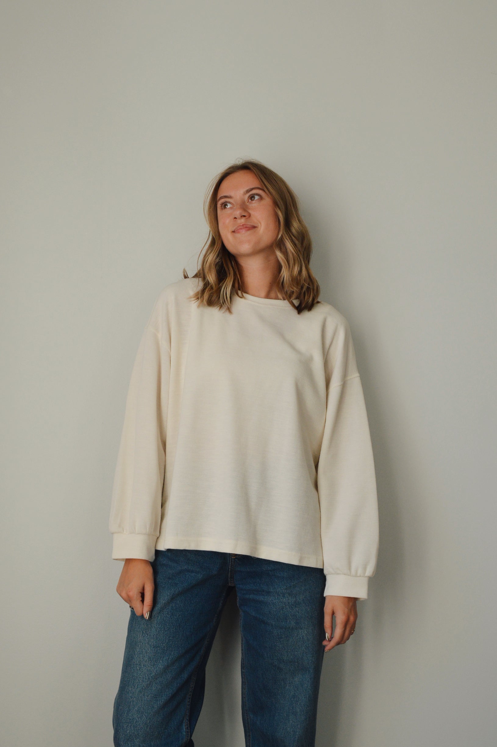 This simple knit top comes in this marshmallow cream color with raw hem accents & a relaxed fit.