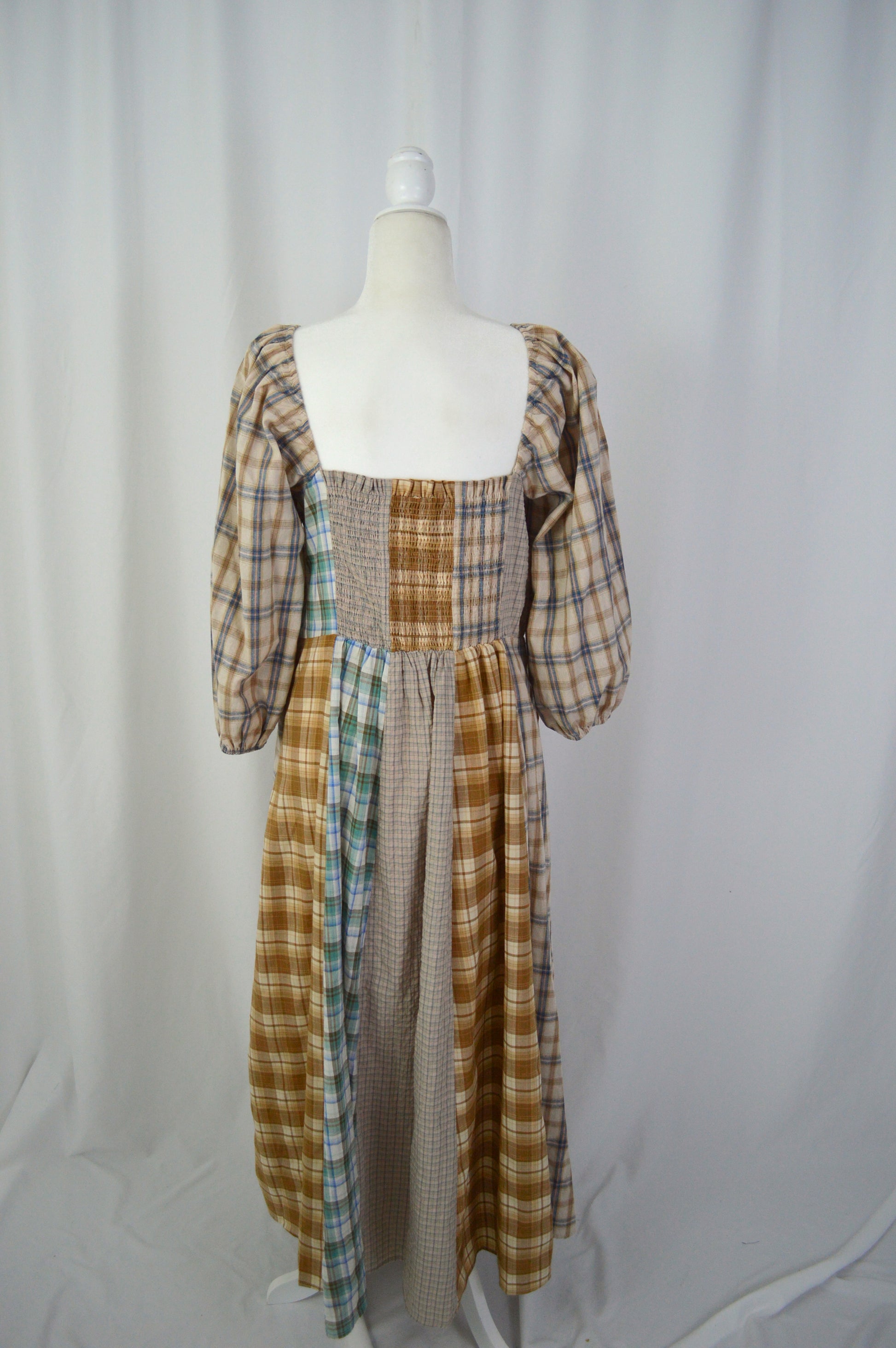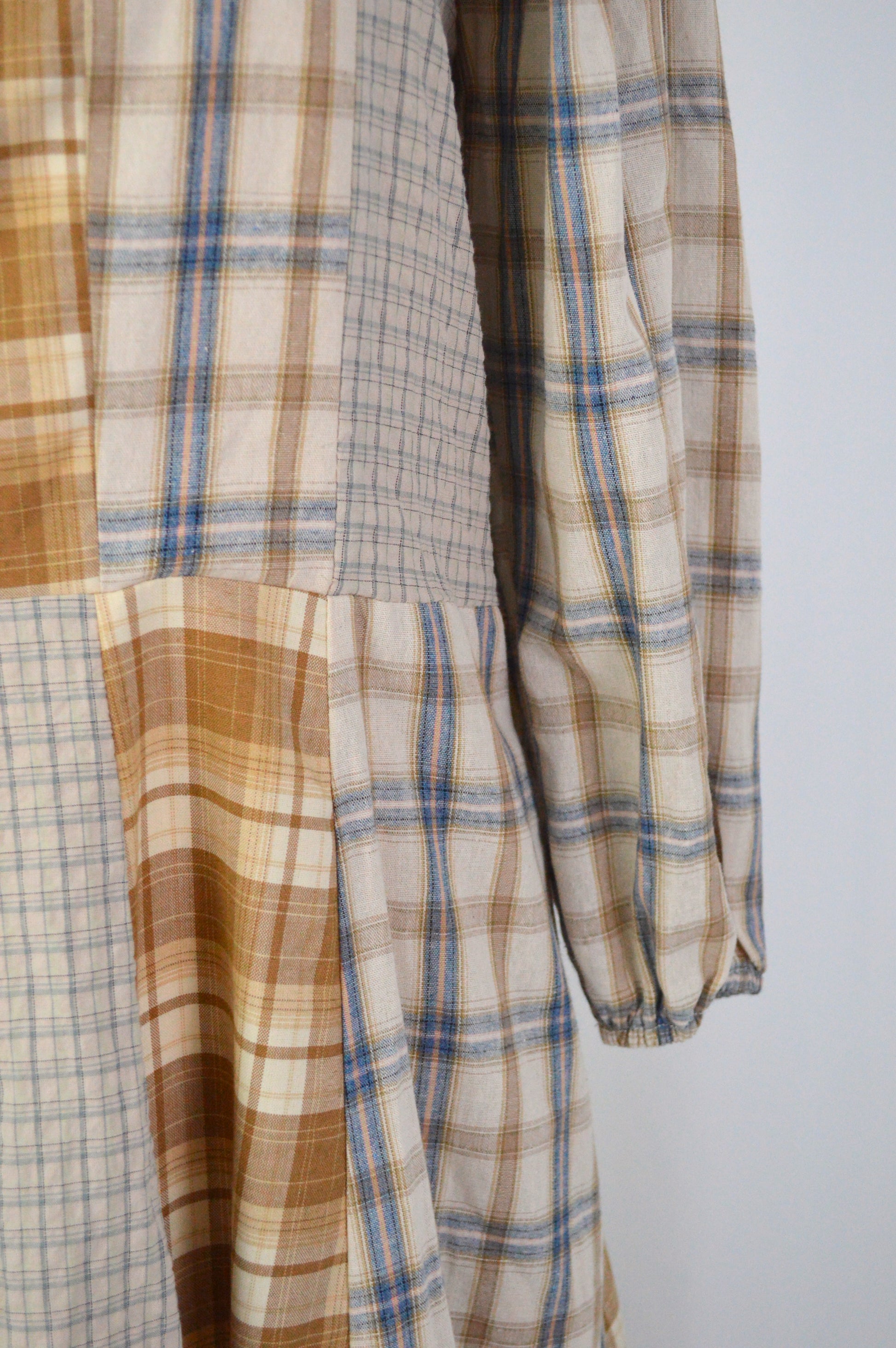 This plaid dress features mixed green, brown & cream hues with a 3/4 sleeve detail.