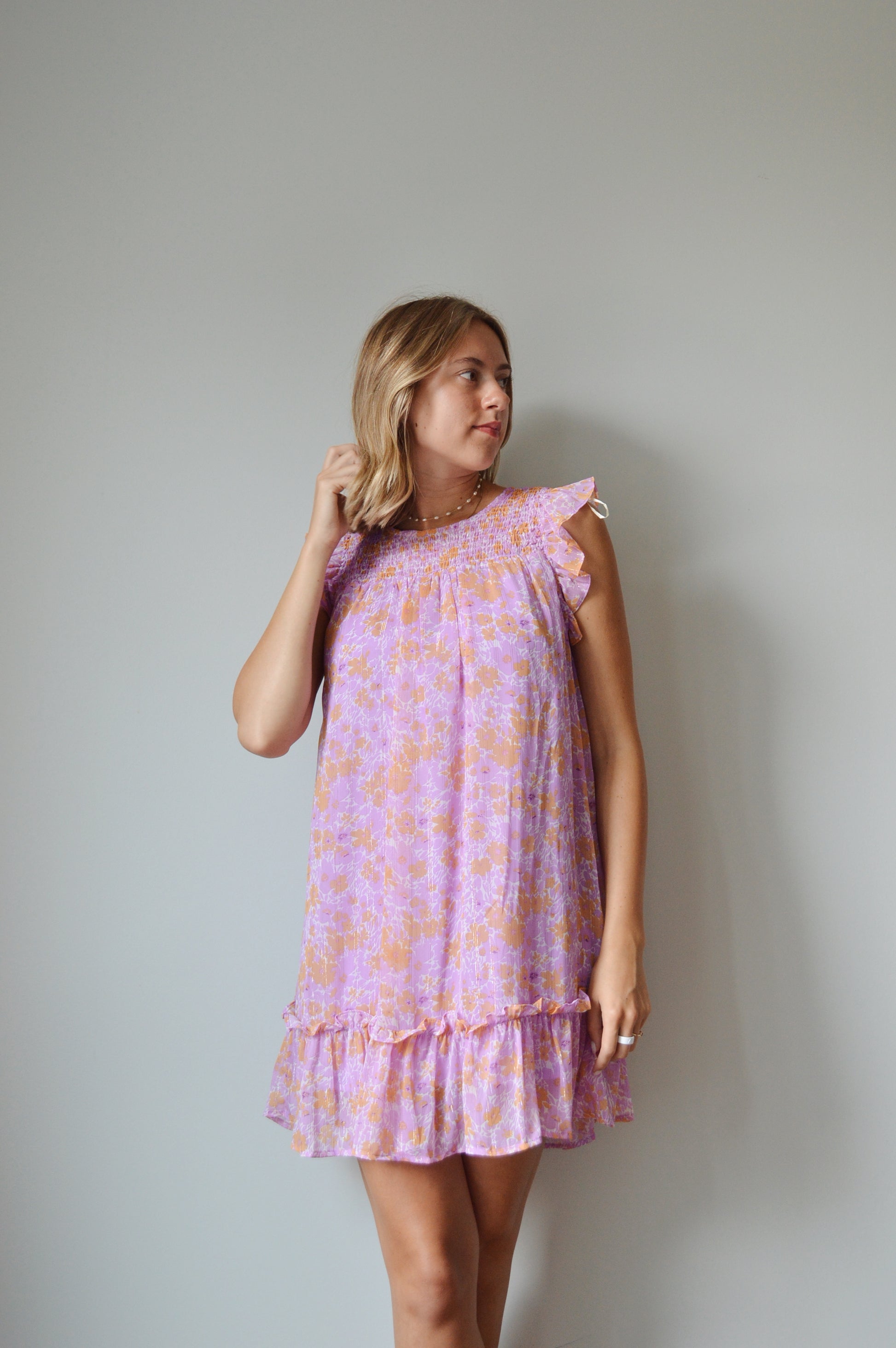 This purple & orange dress will add a pop of color to your summer wardrobe! It comes in a fun floral print & has shimmer detailing throughout!