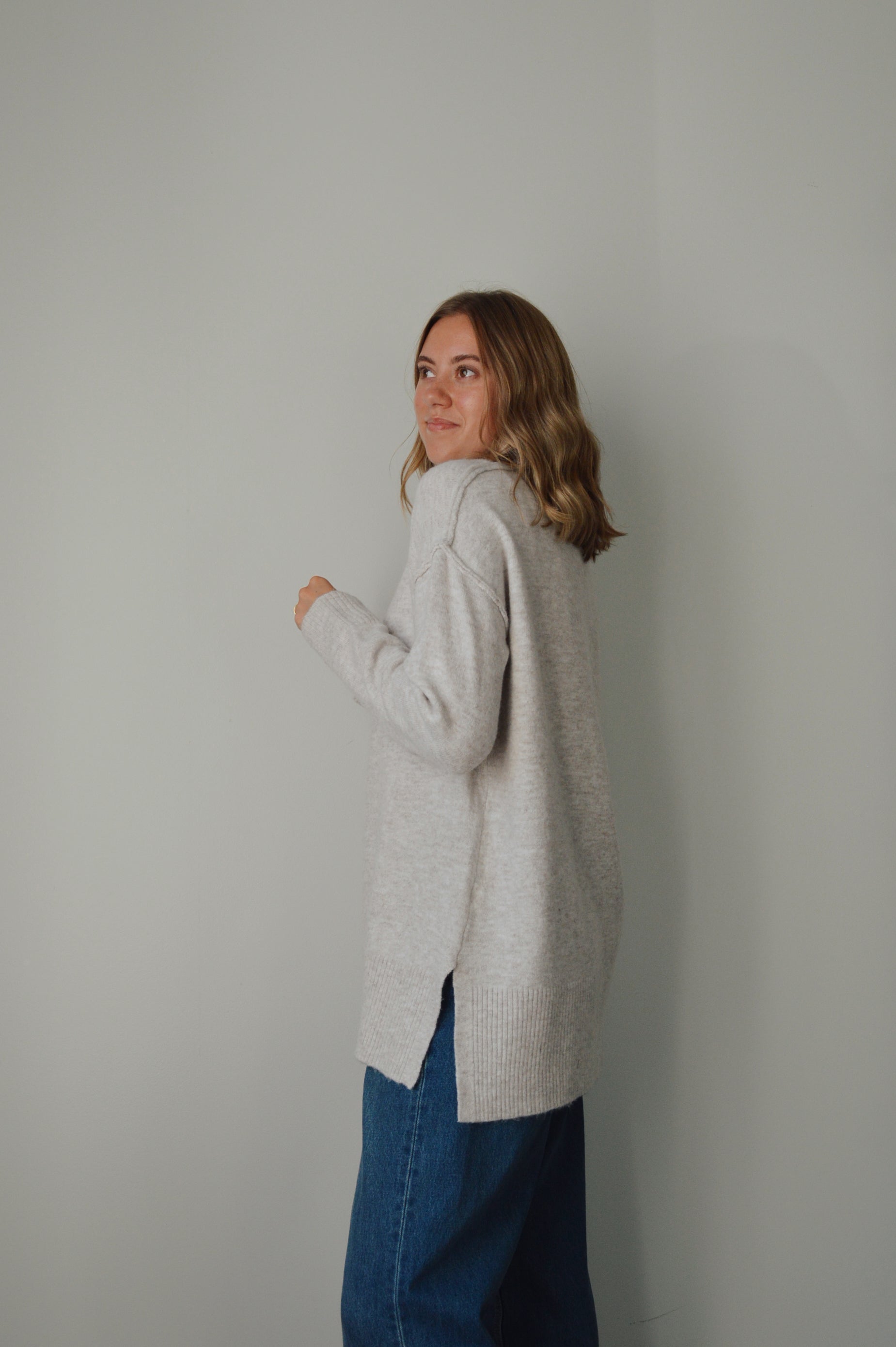 This sweater comes in a beautiful oatmeal color & features a oversized, longer length fit. Perfect for pairing with leggings or jeans!