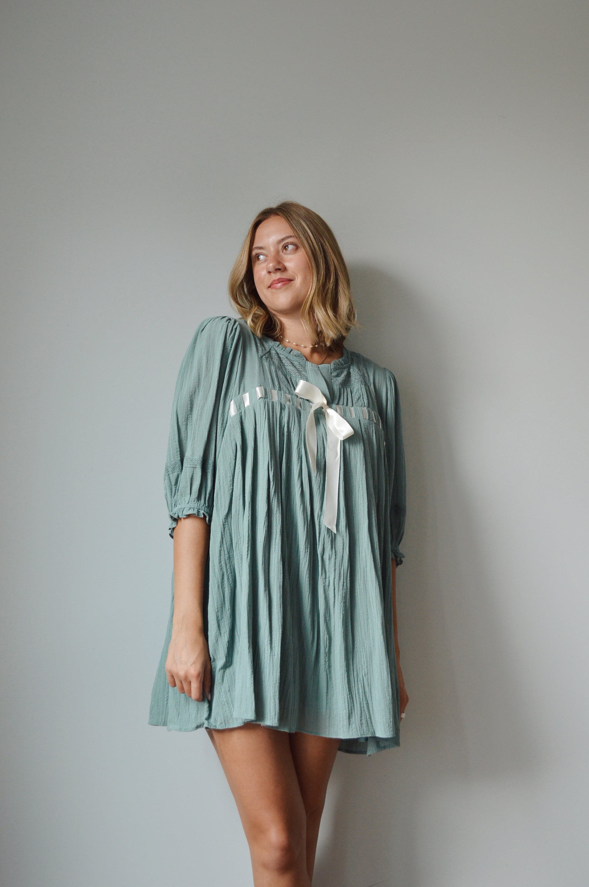 This dress comes in a gorgeous sea fog color & has a bow ribbon detailing across the front.