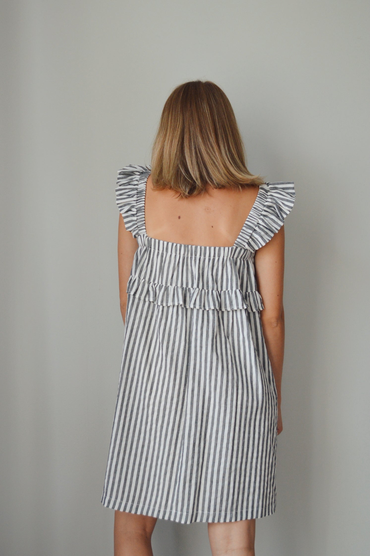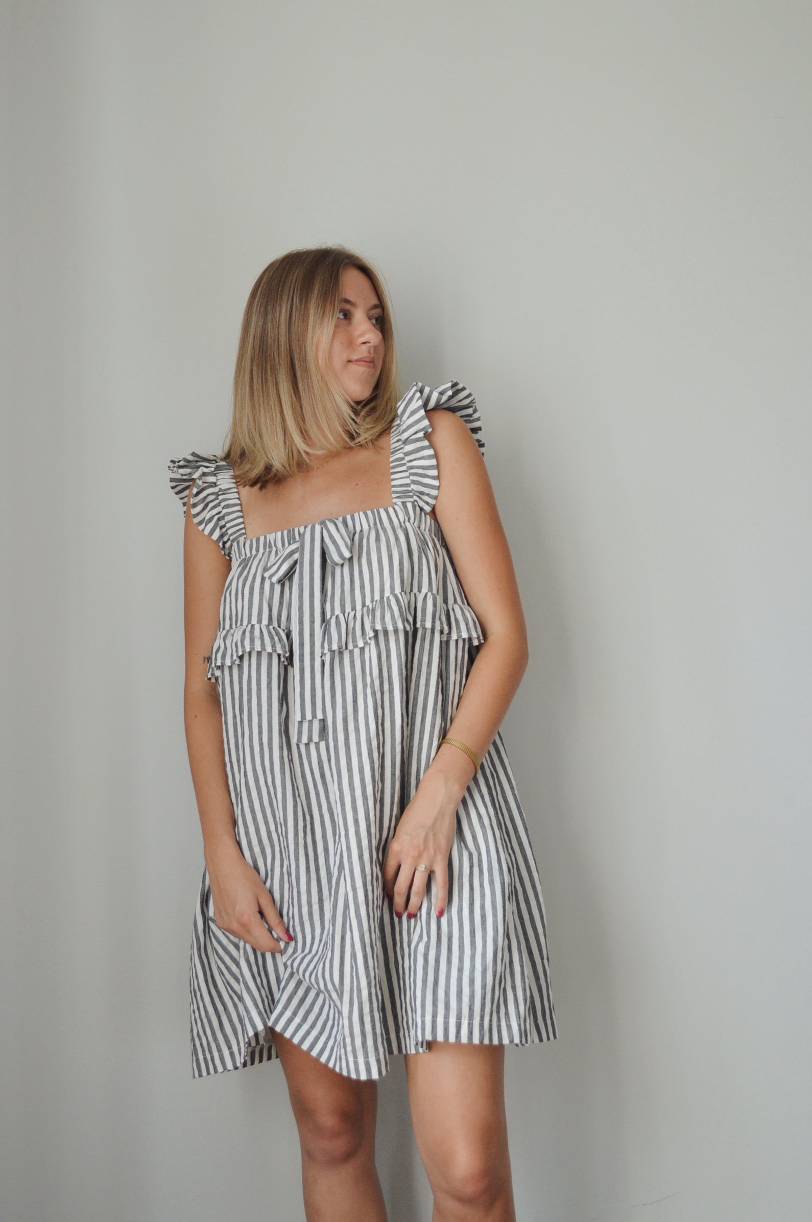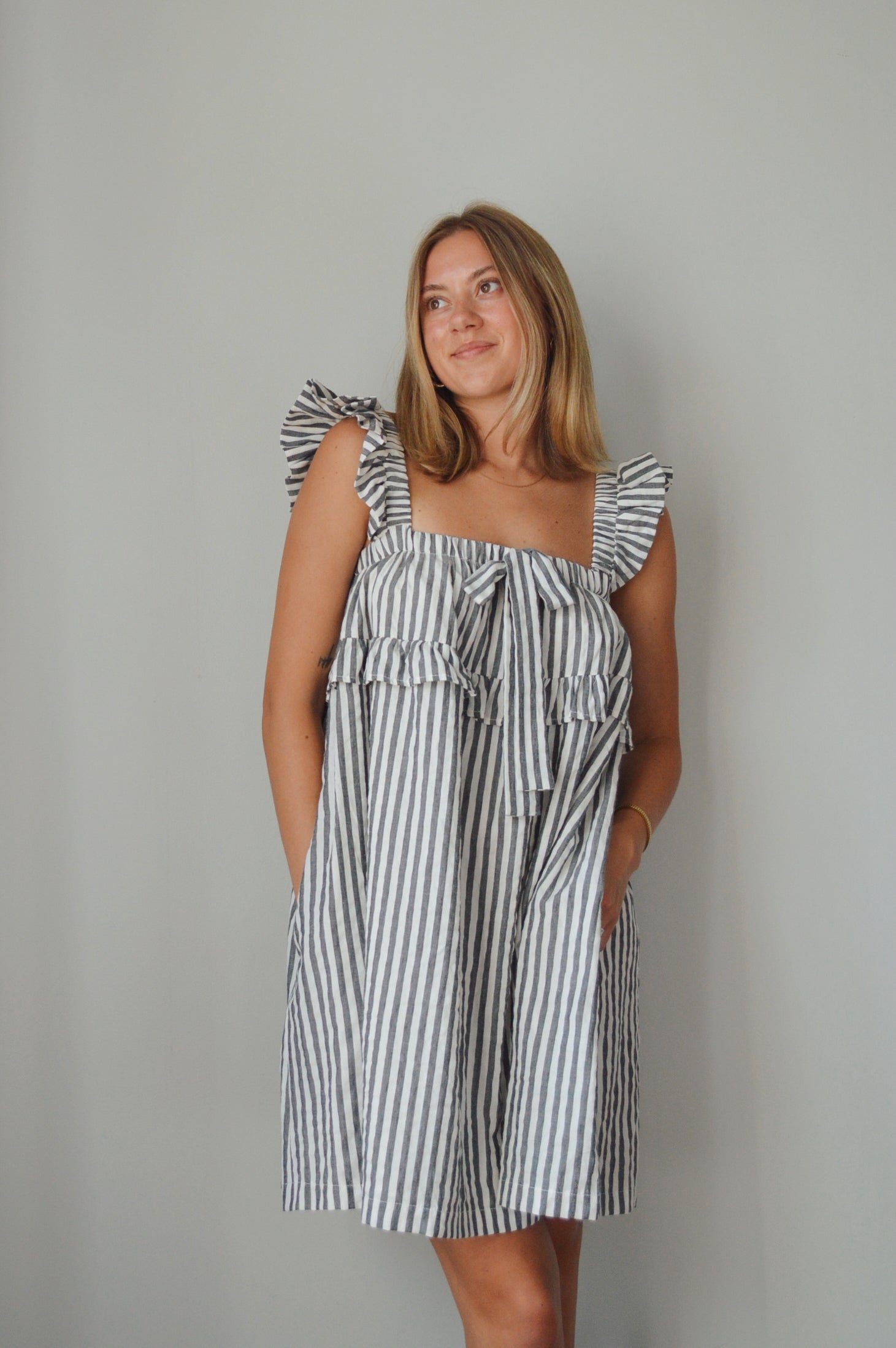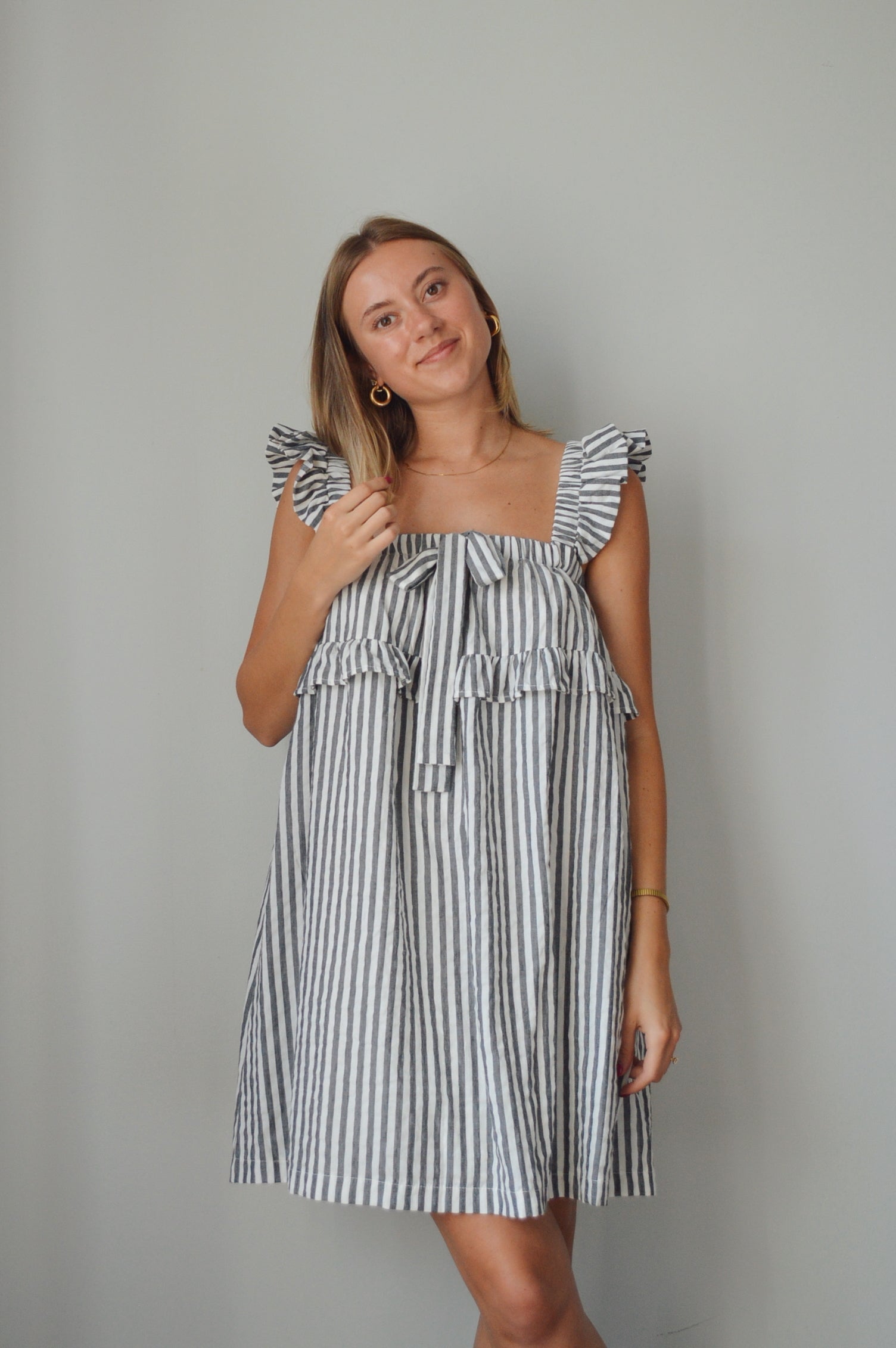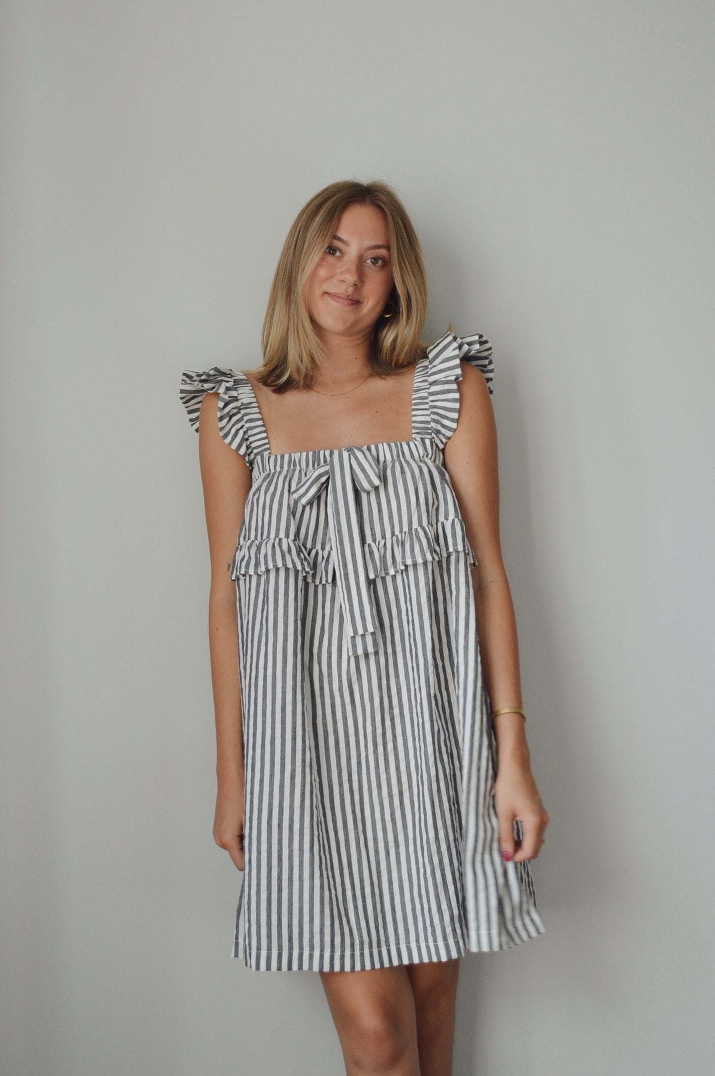 So many cute details on this dress! I love the stripes, ruffles & bow on the front!