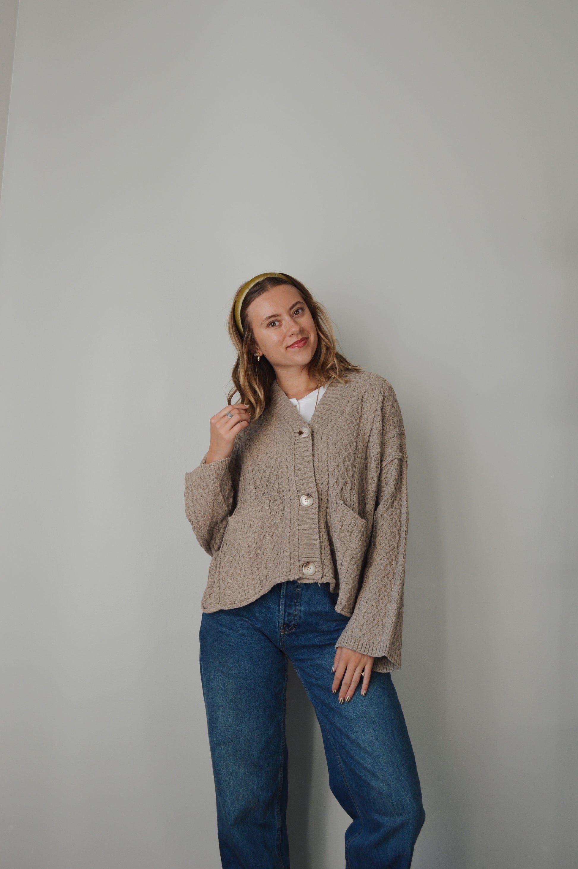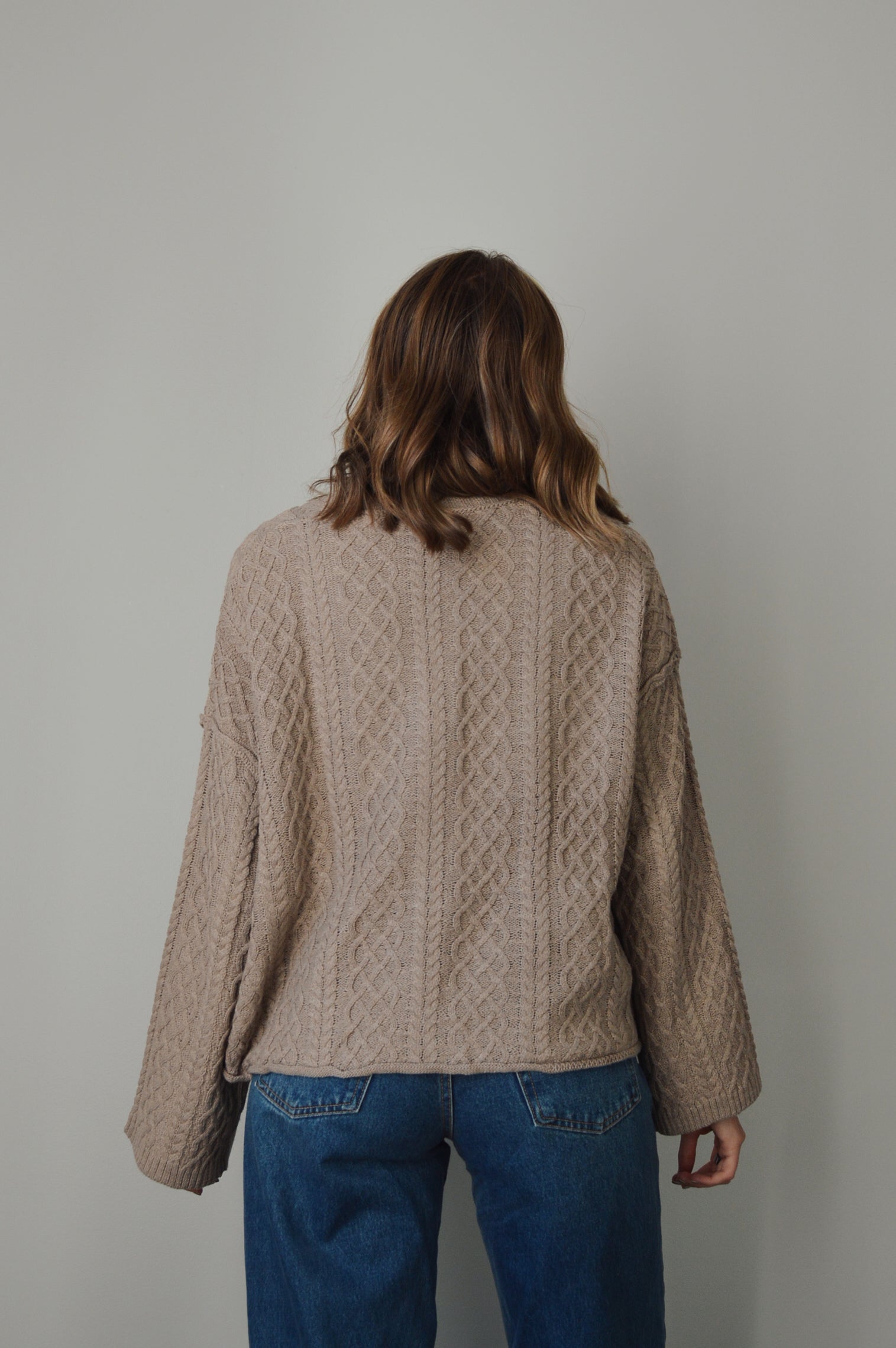 The sweetest cable knit cardigan with wide sleeves & front pockets. Comes in this gorgeous walnut brown.